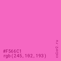 Цвет #F566C1 в цветовой модели RGB обозначается тремя октетами (245, 102, 193) в десятичном формате и #F566C1 в шестнадцатиричном (hex) формате, которые являются интенсивностью красного 245 (hex F5), интенсивность зелёного 102 (hex 66) и интенсивность синего 193 (hex C1).