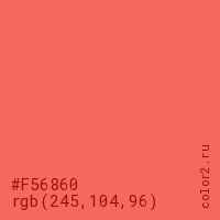 Цвет #F56860 в цветовой модели RGB обозначается тремя октетами (245, 104, 96) в десятичном формате и #F56860 в шестнадцатиричном (hex) формате, которые являются интенсивностью красного 245 (hex F5), интенсивность зелёного 104 (hex 68) и интенсивность синего 96 (hex 60).