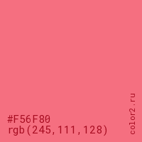 Цвет #F56F80 в цветовой модели RGB обозначается тремя октетами (245, 111, 128) в десятичном формате и #F56F80 в шестнадцатиричном (hex) формате, которые являются интенсивностью красного 245 (hex F5), интенсивность зелёного 111 (hex 6F) и интенсивность синего 128 (hex 80).
