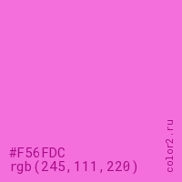 Цвет #F56FDC в цветовой модели RGB обозначается тремя октетами (245, 111, 220) в десятичном формате и #F56FDC в шестнадцатиричном (hex) формате, которые являются интенсивностью красного 245 (hex F5), интенсивность зелёного 111 (hex 6F) и интенсивность синего 220 (hex DC).