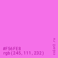 Цвет #F56FE8 в цветовой модели RGB обозначается тремя октетами (245, 111, 232) в десятичном формате и #F56FE8 в шестнадцатиричном (hex) формате, которые являются интенсивностью красного 245 (hex F5), интенсивность зелёного 111 (hex 6F) и интенсивность синего 232 (hex E8).