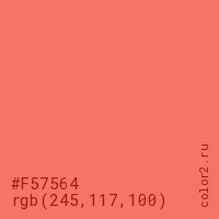 Цвет #F57564 в цветовой модели RGB обозначается тремя октетами (245, 117, 100) в десятичном формате и #F57564 в шестнадцатиричном (hex) формате, которые являются интенсивностью красного 245 (hex F5), интенсивность зелёного 117 (hex 75) и интенсивность синего 100 (hex 64).