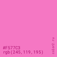 Цвет #F577C3 в цветовой модели RGB обозначается тремя октетами (245, 119, 195) в десятичном формате и #F577C3 в шестнадцатиричном (hex) формате, которые являются интенсивностью красного 245 (hex F5), интенсивность зелёного 119 (hex 77) и интенсивность синего 195 (hex C3).