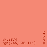 Цвет #F58874 в цветовой модели RGB обозначается тремя октетами (245, 136, 116) в десятичном формате и #F58874 в шестнадцатиричном (hex) формате, которые являются интенсивностью красного 245 (hex F5), интенсивность зелёного 136 (hex 88) и интенсивность синего 116 (hex 74).