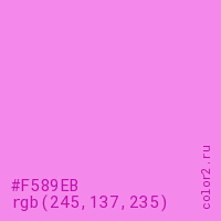 Цвет #F589EB в цветовой модели RGB обозначается тремя октетами (245, 137, 235) в десятичном формате и #F589EB в шестнадцатиричном (hex) формате, которые являются интенсивностью красного 245 (hex F5), интенсивность зелёного 137 (hex 89) и интенсивность синего 235 (hex EB).