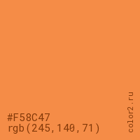 Цвет #F58C47 в цветовой модели RGB обозначается тремя октетами (245, 140, 71) в десятичном формате и #F58C47 в шестнадцатиричном (hex) формате, которые являются интенсивностью красного 245 (hex F5), интенсивность зелёного 140 (hex 8C) и интенсивность синего 71 (hex 47).