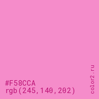 Цвет #F58CCA в цветовой модели RGB обозначается тремя октетами (245, 140, 202) в десятичном формате и #F58CCA в шестнадцатиричном (hex) формате, которые являются интенсивностью красного 245 (hex F5), интенсивность зелёного 140 (hex 8C) и интенсивность синего 202 (hex CA).