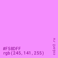 Цвет #F58DFF в цветовой модели RGB обозначается тремя октетами (245, 141, 255) в десятичном формате и #F58DFF в шестнадцатиричном (hex) формате, которые являются интенсивностью красного 245 (hex F5), интенсивность зелёного 141 (hex 8D) и интенсивность синего 255 (hex FF).