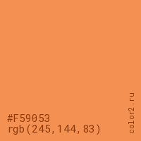 Цвет #F59053 в цветовой модели RGB обозначается тремя октетами (245, 144, 83) в десятичном формате и #F59053 в шестнадцатиричном (hex) формате, которые являются интенсивностью красного 245 (hex F5), интенсивность зелёного 144 (hex 90) и интенсивность синего 83 (hex 53).
