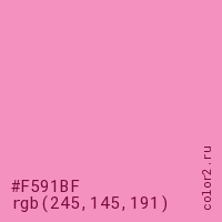 Цвет #F591BF в цветовой модели RGB обозначается тремя октетами (245, 145, 191) в десятичном формате и #F591BF в шестнадцатиричном (hex) формате, которые являются интенсивностью красного 245 (hex F5), интенсивность зелёного 145 (hex 91) и интенсивность синего 191 (hex BF).