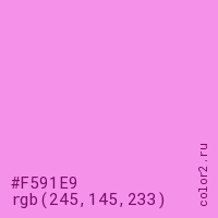 Цвет #F591E9 в цветовой модели RGB обозначается тремя октетами (245, 145, 233) в десятичном формате и #F591E9 в шестнадцатиричном (hex) формате, которые являются интенсивностью красного 245 (hex F5), интенсивность зелёного 145 (hex 91) и интенсивность синего 233 (hex E9).