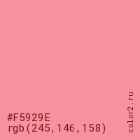 Цвет #F5929E в цветовой модели RGB обозначается тремя октетами (245, 146, 158) в десятичном формате и #F5929E в шестнадцатиричном (hex) формате, которые являются интенсивностью красного 245 (hex F5), интенсивность зелёного 146 (hex 92) и интенсивность синего 158 (hex 9E).