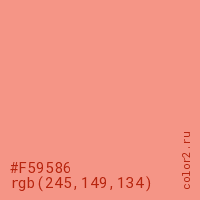 Цвет #F59586 в цветовой модели RGB обозначается тремя октетами (245, 149, 134) в десятичном формате и #F59586 в шестнадцатиричном (hex) формате, которые являются интенсивностью красного 245 (hex F5), интенсивность зелёного 149 (hex 95) и интенсивность синего 134 (hex 86).