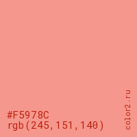 Цвет #F5978C в цветовой модели RGB обозначается тремя октетами (245, 151, 140) в десятичном формате и #F5978C в шестнадцатиричном (hex) формате, которые являются интенсивностью красного 245 (hex F5), интенсивность зелёного 151 (hex 97) и интенсивность синего 140 (hex 8C).