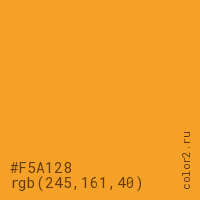 Цвет #F5A128 в цветовой модели RGB обозначается тремя октетами (245, 161, 40) в десятичном формате и #F5A128 в шестнадцатиричном (hex) формате, которые являются интенсивностью красного 245 (hex F5), интенсивность зелёного 161 (hex A1) и интенсивность синего 40 (hex 28).