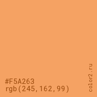 Цвет #F5A263 в цветовой модели RGB обозначается тремя октетами (245, 162, 99) в десятичном формате и #F5A263 в шестнадцатиричном (hex) формате, которые являются интенсивностью красного 245 (hex F5), интенсивность зелёного 162 (hex A2) и интенсивность синего 99 (hex 63).