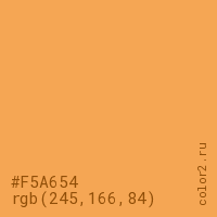 Цвет #F5A654 в цветовой модели RGB обозначается тремя октетами (245, 166, 84) в десятичном формате и #F5A654 в шестнадцатиричном (hex) формате, которые являются интенсивностью красного 245 (hex F5), интенсивность зелёного 166 (hex A6) и интенсивность синего 84 (hex 54).