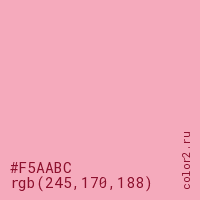 Цвет #F5AABC в цветовой модели RGB обозначается тремя октетами (245, 170, 188) в десятичном формате и #F5AABC в шестнадцатиричном (hex) формате, которые являются интенсивностью красного 245 (hex F5), интенсивность зелёного 170 (hex AA) и интенсивность синего 188 (hex BC).