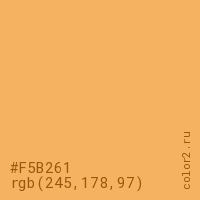 Цвет #F5B261 в цветовой модели RGB обозначается тремя октетами (245, 178, 97) в десятичном формате и #F5B261 в шестнадцатиричном (hex) формате, которые являются интенсивностью красного 245 (hex F5), интенсивность зелёного 178 (hex B2) и интенсивность синего 97 (hex 61).