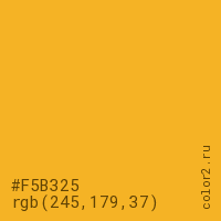 Цвет #F5B325 в цветовой модели RGB обозначается тремя октетами (245, 179, 37) в десятичном формате и #F5B325 в шестнадцатиричном (hex) формате, которые являются интенсивностью красного 245 (hex F5), интенсивность зелёного 179 (hex B3) и интенсивность синего 37 (hex 25).
