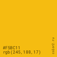 Цвет #F5BC11 в цветовой модели RGB обозначается тремя октетами (245, 188, 17) в десятичном формате и #F5BC11 в шестнадцатиричном (hex) формате, которые являются интенсивностью красного 245 (hex F5), интенсивность зелёного 188 (hex BC) и интенсивность синего 17 (hex 11).