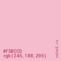 Цвет #F5BCCD в цветовой модели RGB обозначается тремя октетами (245, 188, 205) в десятичном формате и #F5BCCD в шестнадцатиричном (hex) формате, которые являются интенсивностью красного 245 (hex F5), интенсивность зелёного 188 (hex BC) и интенсивность синего 205 (hex CD).