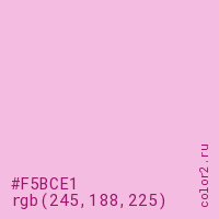 Цвет #F5BCE1 в цветовой модели RGB обозначается тремя октетами (245, 188, 225) в десятичном формате и #F5BCE1 в шестнадцатиричном (hex) формате, которые являются интенсивностью красного 245 (hex F5), интенсивность зелёного 188 (hex BC) и интенсивность синего 225 (hex E1).