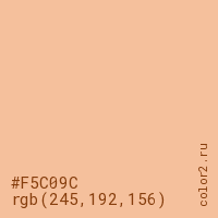 Цвет #F5C09C в цветовой модели RGB обозначается тремя октетами (245, 192, 156) в десятичном формате и #F5C09C в шестнадцатиричном (hex) формате, которые являются интенсивностью красного 245 (hex F5), интенсивность зелёного 192 (hex C0) и интенсивность синего 156 (hex 9C).