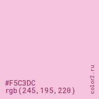 Цвет #F5C3DC в цветовой модели RGB обозначается тремя октетами (245, 195, 220) в десятичном формате и #F5C3DC в шестнадцатиричном (hex) формате, которые являются интенсивностью красного 245 (hex F5), интенсивность зелёного 195 (hex C3) и интенсивность синего 220 (hex DC).