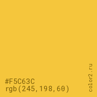 Цвет #F5C63C в цветовой модели RGB обозначается тремя октетами (245, 198, 60) в десятичном формате и #F5C63C в шестнадцатиричном (hex) формате, которые являются интенсивностью красного 245 (hex F5), интенсивность зелёного 198 (hex C6) и интенсивность синего 60 (hex 3C).