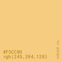 Цвет #F5CC80 в цветовой модели RGB обозначается тремя октетами (245, 204, 128) в десятичном формате и #F5CC80 в шестнадцатиричном (hex) формате, которые являются интенсивностью красного 245 (hex F5), интенсивность зелёного 204 (hex CC) и интенсивность синего 128 (hex 80).