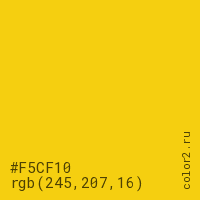 Цвет #F5CF10 в цветовой модели RGB обозначается тремя октетами (245, 207, 16) в десятичном формате и #F5CF10 в шестнадцатиричном (hex) формате, которые являются интенсивностью красного 245 (hex F5), интенсивность зелёного 207 (hex CF) и интенсивность синего 16 (hex 10).