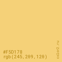 Цвет #F5D178 в цветовой модели RGB обозначается тремя октетами (245, 209, 120) в десятичном формате и #F5D178 в шестнадцатиричном (hex) формате, которые являются интенсивностью красного 245 (hex F5), интенсивность зелёного 209 (hex D1) и интенсивность синего 120 (hex 78).