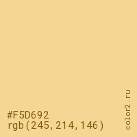 Цвет #F5D692 в цветовой модели RGB обозначается тремя октетами (245, 214, 146) в десятичном формате и #F5D692 в шестнадцатиричном (hex) формате, которые являются интенсивностью красного 245 (hex F5), интенсивность зелёного 214 (hex D6) и интенсивность синего 146 (hex 92).