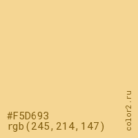 Цвет #F5D693 в цветовой модели RGB обозначается тремя октетами (245, 214, 147) в десятичном формате и #F5D693 в шестнадцатиричном (hex) формате, которые являются интенсивностью красного 245 (hex F5), интенсивность зелёного 214 (hex D6) и интенсивность синего 147 (hex 93).