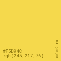 Цвет #F5D94C в цветовой модели RGB обозначается тремя октетами (245, 217, 76) в десятичном формате и #F5D94C в шестнадцатиричном (hex) формате, которые являются интенсивностью красного 245 (hex F5), интенсивность зелёного 217 (hex D9) и интенсивность синего 76 (hex 4C).