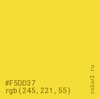Цвет #F5DD37 в цветовой модели RGB обозначается тремя октетами (245, 221, 55) в десятичном формате и #F5DD37 в шестнадцатиричном (hex) формате, которые являются интенсивностью красного 245 (hex F5), интенсивность зелёного 221 (hex DD) и интенсивность синего 55 (hex 37).