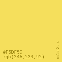 Цвет #F5DF5C в цветовой модели RGB обозначается тремя октетами (245, 223, 92) в десятичном формате и #F5DF5C в шестнадцатиричном (hex) формате, которые являются интенсивностью красного 245 (hex F5), интенсивность зелёного 223 (hex DF) и интенсивность синего 92 (hex 5C).