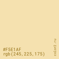 Цвет #F5E1AF в цветовой модели RGB обозначается тремя октетами (245, 225, 175) в десятичном формате и #F5E1AF в шестнадцатиричном (hex) формате, которые являются интенсивностью красного 245 (hex F5), интенсивность зелёного 225 (hex E1) и интенсивность синего 175 (hex AF).