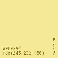 Цвет #F5E896 в цветовой модели RGB обозначается тремя октетами (245, 232, 150) в десятичном формате и #F5E896 в шестнадцатиричном (hex) формате, которые являются интенсивностью красного 245 (hex F5), интенсивность зелёного 232 (hex E8) и интенсивность синего 150 (hex 96).