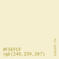 Цвет #F5EFCF в цветовой модели RGB обозначается тремя октетами (245, 239, 207) в десятичном формате и #F5EFCF в шестнадцатиричном (hex) формате, которые являются интенсивностью красного 245 (hex F5), интенсивность зелёного 239 (hex EF) и интенсивность синего 207 (hex CF).
