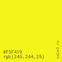 Цвет #F5F419 в цветовой модели RGB обозначается тремя октетами (245, 244, 25) в десятичном формате и #F5F419 в шестнадцатиричном (hex) формате, которые являются интенсивностью красного 245 (hex F5), интенсивность зелёного 244 (hex F4) и интенсивность синего 25 (hex 19).