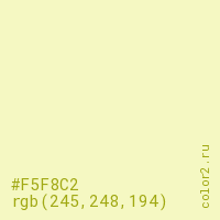 Цвет #F5F8C2 в цветовой модели RGB обозначается тремя октетами (245, 248, 194) в десятичном формате и #F5F8C2 в шестнадцатиричном (hex) формате, которые являются интенсивностью красного 245 (hex F5), интенсивность зелёного 248 (hex F8) и интенсивность синего 194 (hex C2).
