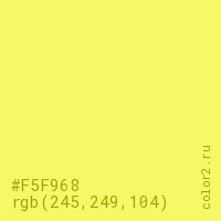 Цвет #F5F968 в цветовой модели RGB обозначается тремя октетами (245, 249, 104) в десятичном формате и #F5F968 в шестнадцатиричном (hex) формате, которые являются интенсивностью красного 245 (hex F5), интенсивность зелёного 249 (hex F9) и интенсивность синего 104 (hex 68).