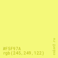 Цвет #F5F97A в цветовой модели RGB обозначается тремя октетами (245, 249, 122) в десятичном формате и #F5F97A в шестнадцатиричном (hex) формате, которые являются интенсивностью красного 245 (hex F5), интенсивность зелёного 249 (hex F9) и интенсивность синего 122 (hex 7A).