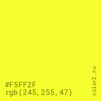 Цвет #F5FF2F в цветовой модели RGB обозначается тремя октетами (245, 255, 47) в десятичном формате и #F5FF2F в шестнадцатиричном (hex) формате, которые являются интенсивностью красного 245 (hex F5), интенсивность зелёного 255 (hex FF) и интенсивность синего 47 (hex 2F).