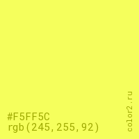 Цвет #F5FF5C в цветовой модели RGB обозначается тремя октетами (245, 255, 92) в десятичном формате и #F5FF5C в шестнадцатиричном (hex) формате, которые являются интенсивностью красного 245 (hex F5), интенсивность зелёного 255 (hex FF) и интенсивность синего 92 (hex 5C).