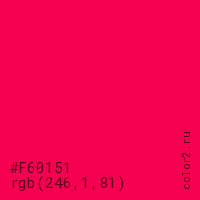 Цвет #F60151 в цветовой модели RGB обозначается тремя октетами (246, 1, 81) в десятичном формате и #F60151 в шестнадцатиричном (hex) формате, которые являются интенсивностью красного 246 (hex F6), интенсивность зелёного 1 (hex 01) и интенсивность синего 81 (hex 51).