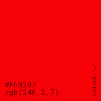 Цвет #F60207 в цветовой модели RGB обозначается тремя октетами (246, 2, 7) в десятичном формате и #F60207 в шестнадцатиричном (hex) формате, которые являются интенсивностью красного 246 (hex F6), интенсивность зелёного 2 (hex 02) и интенсивность синего 7 (hex 07).