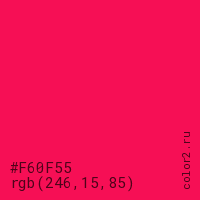 Цвет #F60F55 в цветовой модели RGB обозначается тремя октетами (246, 15, 85) в десятичном формате и #F60F55 в шестнадцатиричном (hex) формате, которые являются интенсивностью красного 246 (hex F6), интенсивность зелёного 15 (hex 0F) и интенсивность синего 85 (hex 55).
